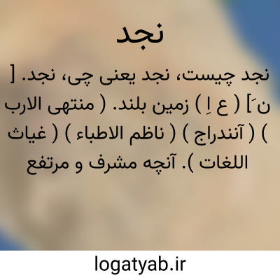 وجد نه نجد است که رفتن توان.؟|| کار روشن آشکار. ( از اقرب الموارد ). || غم. اندوه. ( منتهی الارب ) ( آنندراج ) ( فرهنگ نظام ) ( ناظم الاطبا ). کرب و غم. ( اقرب الموارد ). || پستان. ( منتهی الارب ) ( آنندراج ) ( فرهنگ نظام ) ( ناظم الاطبا ). ثدی. ( ناظم الاطباء ) ( از اقرب الموارد ). || درختی است شبیه درخت شبرم. ( منتهی الارب ) ( آنندراج ) ( ناظم الاطباء ) ( اقرب الموارد ). || آنچه بدان خانه را بیارایند از فرش و گستردنی و بساط و بالش و جز آن. ( منتهی الارب ) ( آنندراج ) ( ناظم الاطبا ) ( اقرب الموارد ). آرایش خانه. ( غیاث اللغات ). اثاثه خانه. ( از فرهنگ نظام ). ج، نجود، نجاد. || جای بی درخت. ( منتهی الارب ) ( آنندراج ) ( ناظم الاطباء ). مکان بی درخت. ( فرهنگ نظام ) ( از اقرب الموارد ) ( از المنجد ). || راهنمای ماهر و رسا. ( منتهی الارب ) ( از آنندراج ) ( ناظم الاطباء ). راهنمای ماهر. ( فرهنگ نظام ). دلیل ماهر. ( فرهنگ نظام ) ( اقرب الموارد ). || بدن باخوی. || چیرگی. غلبه. ( منتهی الارب ) ( ناظم الاطباء ). || تشنگی اشتر که سیر نشود از آب. ( مهذب الاسما ). || پناه. ( غیاث اللغات ). || خوشی. ( سامی ). ( از غیاث اللغات ). || ( ص ) سخت دلیر. ( مهذب الاسما ). بی باک. ( سامی ). || دلیر درگذرنده در امور که دیگران در آن عاجز باشند. ( منتهی الارب ) ( آنندراج ). شجاع و دلیر درگذرنده درامور که دیگران در آن عاجز باشند. نَجِد. نَجُد. ( ناظم الاطباء ) ( از اقرب الموارد ). نجید. ( اقرب الموارد ) ج، انجاد. || رجل نجد؛ مرد شتاب در حاجت. ( منتهی الارب ) ( ناظم الاطباء ). سریعالاجابة فی ما دعی الیه. ( اقرب الموارد ). نُجُد. ( المنجد ). که به چالاکی در پیشامدها اقدام کند. ج، انجاد. || ( مص ) اندوهناک گردیدن. ( از منتهی الارب ) ( از ناظم الاطباء ). غمگین شدن. ( از اقرب الموارد ) ( از المنجد ). || اندوهگن کردن. ( زوزنی ). || رنج دیدن. ( غیاث اللغات ) ( از منتهی الارب ) ( از ناظم الاطباء ). || روان شدن خوی بر اندام. ( از منتهی الارب ) ( از ناظم الاطباء ). || اعانت کردن کسی را. ( از ناظم الاطباء ) ( از اقرب الموارد ). یاری دادن. ( زوزنی ). || هویدا و واضح گردیدن. ( از منتهی الارب ). || غلبه کردن به شجاعت و چیره شدن. ( منتهی الارب ) ( آنندراج ). غلبه کردن بر کسی. ( از اقرب الموارد ) ( از المنجد ). مقهور کردن. ( تاج المصادر بیهقی ).