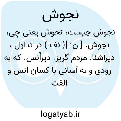 نجوش. [ ن َ ]( نف ) در تداول، دیرآشنا. مردم گریز. دیراُنس. که به زودی و به آسانی با کسان انس و الفت نگیرد. که با مردم نجوشد. که با آشنایان و کسان، گرم و مهربان نیست.