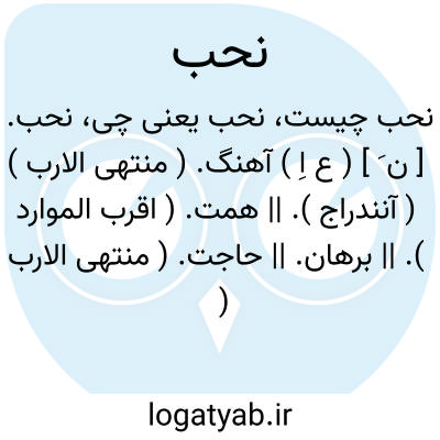 نحب. [ ن َ ] ( ع اِ ) آهنگ. ( منتهی الارب ) ( آنندراج ). || همت. ( اقرب الموارد ). || برهان. || حاجت. ( منتهی الارب ) ( آنندراج )( اقرب الموارد ). || سرفه. ( منتهی الارب ) ( آنندراج ). سعال. ( اقرب الموارد ). || خواب.( منتهی الارب ) ( آنندراج ). نوم. ( لسان العرب ). || یوم. ( اقرب الموارد ). || فربهی. ( منتهی الارب ) ( آنندراج ). سمن. ( اقرب الموارد ). || سختی. ( منتهی الارب ) ( آنندراج ). شدت. ( اقرب الموارد ). || قمار. || موت. || اجل. ( منتهی الارب ) ( آنندراج ) ( اقرب الموارد ). || طول. ( اقرب الموارد ). || مدت. ( منتهی الارب ) ( آنندراج )( اقرب الموارد ). روزگار: قضی نحبه؛ مدت به سر آورد.بمرد. ( یادداشت مؤلف ). || نذر. ( اقرب الموارد ) ( از مهذب الاسما ). گویند: قضی نحبه؛ یعنی مرد کشته شد در راه خدا گوئی مرگ نذری بوده است بر گردن وی. هو نحب علیه؛ ای نذر. ( اقرب الموارد ). || هنگام. ( منتهی الارب ) ( آنندراج ). وقت. ( اقرب الموارد ). || نَفس. || شتر کلان جثه. ( منتهی الارب ) ( آنندراج ) ( اقرب الموارد ). || امر بزرگ و سترگ. ( منتهی الارب ) ( آنندراج ). خطر عظیم. ( اقرب الموارد ). || ( مص ) سخت گریستن. ( منتهی الارب ) ( آنندراج ) ( از اقرب الموارد ). اشدالبکاء. ( اقرب الموارد ). || آواز برداشتن در گریه. نحیب. ( منتهی الارب ) ( آنندراج ). به گریه صدا بلند کردن. ( از اقرب الموارد ). || با هم گرو بستن به تاختن. ( منتهی الارب ). || مراهنه. ( ناظم الاطباء ): نحب به نحباً؛ راهن. ( اقرب الموارد ). || نذر کردن. ( منتهی الارب ) ( آنندراج ) ( از اقرب الموارد ) ( تاج المصادر بیهقی ). چیزی بر خود واجب کردن. ( ترجمان علامه جرجانی ). || مردن. ( منتهی الارب ) ( آنندراج ). بیمار کردن و بمردن. ( زوزنی ). || در خواب شدن. || به شتاب رفتن، یا سبک رفتن. ( منتهی الارب ) ( آنندراج ). کوشش کردن در سیر. ( از اقرب الموارد ). سیر سریع یا خفیف. ( از اقرب الموارد ). || سرفیدن شتر، یا سرفیدن. ( از منتهی الارب ) ( آنندراج ). نحاب. ( اقرب الموارد ).