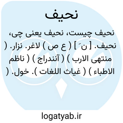 نحیف. [ ن َ ] ( ع ص ) لاغر. نزار. ( منتهی الارب ) ( آنندراج ) ( ناظم الاطباء ) ( غیاث اللغات ). خول. ( ناظم الاطباء ). مرد عاجز. ( آنندراج ) ( غیاث اللغات ). قضیف. ( از منتهی الارب ). ضاوی. ( یادداشت مؤلف ). تکیده. ج، نحاف، نحفاء: