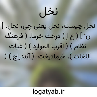 ( اسم ) ۱ - درخت خرماخرمابن: منم نخل ودی ماه نحل آمداینجا بهارکرم رابهایی نبینم. ( خاقانی.سج.۲ ) ۲۹۳ - درخت: زعفران کشورماگریه بسیار آورد نخل صندل دردسردرعهدمابار آورد. ( رضی دانش فرنظا. ) ۳ - درخت مانندی که ازموم وکاغذوپارچه وجز آن سازندوماننددرخت دارای ساقه وشاخه وگل ومیوه باشد: نخل اگرازموم سازی درریاض روضه اش گرددازنشوونماسرسبزو آردبارگل. ( وحشی.چا.امیرکبیر۴ ) ۲۳۴ - تابوت بزرگ وبلندی که باپارچه های قیمتی تزیین کنندوبر آن آیینه هاوخنجرها وشمشیرهانصب نمایندوروزعاشورابعنوان تابوت حسین بن علی ۴ دردسته حرکت دهند وگاهی نیزبرای مرده ای جوان آنراحمل ویا در تکیه نصب کنند: کشته عشقم و آن نیست که درشهرکسی نخل تابوت مرابیندوشیون نکند. ( شانی تکلوفرنظا. ) یاترکیبات: نخل چتری.مقل مکی.یانخل خرما.درخت خرما.نخل خرمای مریم.مریم درزمان تولدعیسی ۴ آنگاه که ازدردزه بی تاب شده بوددرصحرازیردرخت خرمایی خشک جای گرفت وبفرمان الهی درخت سبزشدومیوه داد: بلی نخل خرمای مریم بخندد بر آن نخل مومین که علان نماید. ( خاقانی.سج.۱۳۲ ) یانخل روغنی.درختی است زیباازتیره نخلها بارتفاع تقریبی ۲٠ متر.منشااصلی این گونه نخل جنگلهای گینه است ولی امروزه درنقاط غربی افریقاوهمچنین کنگو فراوان است.تنه این درخت استوانه یی و برگهایش متعددببزرگی ۳ تا۵ مترکه درقسمت انتهایی ساقه قراردارند.گلهای نروماده این گیاه ازهم مجزاهستندولی برروی یک درخت قرار دارند.تعدادمیوه های هررژیم این گونه نخل بین ۱٠٠٠ تا۱۵٠٠ عددمیباشدوهرمیوه ببزرگی یک گردواست ودارای میان برخوراکی و روغن دار وهمچنین دارای هسته ای سخت است که محتوی مغزروغن دارمیباشد.روغنی که از میان برمیوه گرفته میشودموسوم به روغن پالم است که در گرمای ۴٠ درجه حالت مایع پیدامیکندورنگ آن زردنارنجی است ودرحالت تازه دارای بوی بنفشه است وچون بسهولت تند میشودفقط درمحل استخراج بمصرف تغذیه میرسد ویادرصابون پزی وچرب کردن چرخ ماشین آلات بکارمیرود. روغنی که ازمغزهسته این گیاه بدست میاید بنام روغن پالمیست موسوم است که درگرمای ۲۵ درجه حالت میعان پیدامیکندو منحصرابمصرف تهیه صابون وساختن شمع میرسد درخت روغنخرمای روغندرخت روغن بمبوک نخلهالزیتیاغ خرما آغاجی.یانخل طور.درختی وادیایمن بحوالی کوه طورکه موسی ۴ انوارحق تعالی رابر آن مشاهده کرد.یانخل عزا. یانخل ماتم.یانخل محرم.یانخل مریم. یانخل مومین.یامسافر.مقل مکی.