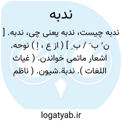 ندبه. [ ن ُ ب َ / ب ِ ] ( از ع، اِ ) نوحه. اشعار ماتمی خواندن. ( غیاث اللغات ). ندبة.شیون. ( ناظم الاطباء ) ( غیاث اللغات ). گریه و زاری. ( ناظم الاطباء ). افغان. گریستن برای مرده:
