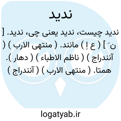ندید. [ ن َ ] ( ع اِ ) مانند. ( منتهی الارب ) ( آنندراج ) ( ناظم الاطباء ) ( دهار ). همتا. ( منتهی الارب ) ( آنندراج ) ( ناظم الاطباء ) ( غیاث اللغات ) ( مهذب الاسماء ). ند. ( اقرب الموارد ). نظیر. ( غیاث اللغات ). شبیه. عدیل. مثل. ج، نُدَداء، انداد: