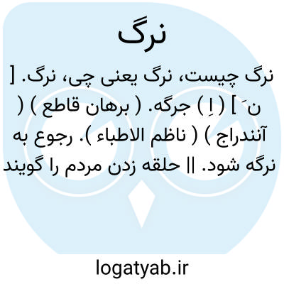 نرگ. [ ن َ ] ( اِ ) جرگه. ( برهان قاطع ) ( آنندراج ) ( ناظم الاطباء ). رجوع به نرگه شود. || حلقه زدن مردم را گویند به جهت محافظت شکار تا از میان بیرون نرود. ( برهان قاطع ) ( آنندراج ) ( از ناظم الاطباء ). حلقه زدن لشکر برای شکار. ( غیاث اللغات ). رده و پره باشد که به جهت شکار زنند تا شکاری بیرون نرود. ( فرهنگ خطی از المؤید ). || زورخانه پهلوانان. ( غیاث اللغات از شرح گل کشتی ).