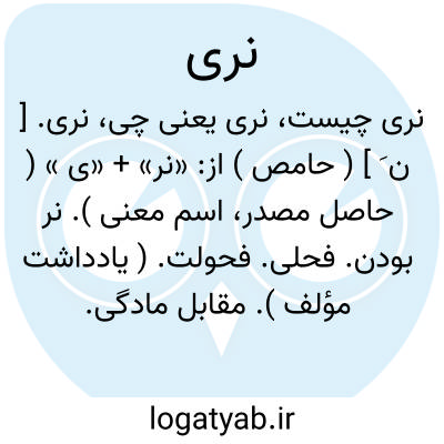 نری. [ ن َ ] ( حامص ) از: «نر» + «ی » ( حاصل مصدر، اسم معنی ). نر بودن. فحلی. فحولت. ( یادداشت مؤلف ). مقابل مادگی. || مردانگی. شجاعت. رجوع به نَرّی شود. || ( اِ ) آلت رجولیت را گویند مطلقاً، خواه از انسان و خواه از حیوان دیگر باشد. ( برهان قاطع ) ( آنندراج ). آلت تناسل. نره. ( از ناظم الاطباء ). || نوع مذکر. ( ناظم الاطباء ). || نر از گوسپندان. قوچ. گوسپند نر. مقابل میش. || پوست میش پیراسته شده. ( ناظم الاطباء ).