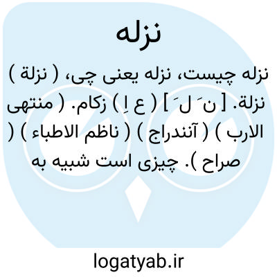 ( اسم ) التهاب حادیامزمن نسج مخاطی همراه باازدیادترشحات معمولی یاعفونی این نسج: ضعیف وبیمارناک وبیشترنقرس ونزله و سرطان... یابادنزله.تورمی که براثرنزله دندان درانساج نرم صورت پدیدمیایدوظاهرا منظره یک سلولیت رادارد.یانزله بینی.زکام یانزله دندان.عبارت ازالتهاب و آماس نواحی نرم گونه است که براثرنفوذچرک وخون در بافتهای نرم مجاوردندان چرکی پدیدمیاید وتمام نواحی مجاوربندلانه دندان مووف را فرامیگیرد. معمولانزله دندانی ازعواقب عفونت و آماسحادبنددندان یاالتهاب چربی بنددندان است.برخی دندان پزشکان نزله دندانی رانوعیلنفوسلولیت منتشریامتمرکز صورت میدانند پیله.