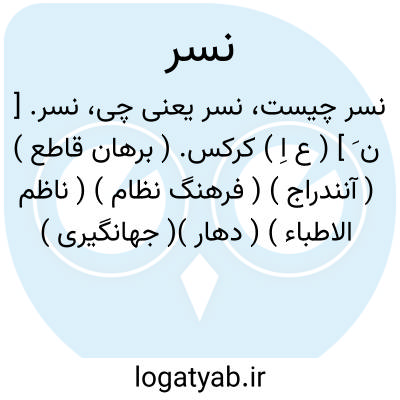 نسر. [ ن َ ] ( ع اِ ) کرکس. ( برهان قاطع ) ( آنندراج ) ( فرهنگ نظام ) ( ناظم الاطباء ) ( دهار )( جهانگیری ) ( مهذب الاسماء ) ( غیاث اللغات ) ( نصاب ). ججا. ( ناظم الاطباء ). و آن پرنده ای است مردارخوار، گویند اگر از مشرق پرواز کند و بلند شود در یک روز به مغرب رود و باز از مغرب پرواز کند و بلند شود و در همان روز به مشرق آید و این بسیار عجیب است، واﷲ اعلم. ( برهان قاطع ). ابوالطیر. ابوالابرد. ابوالاصبع. ابومالک. ابوالمنهال. ابویحیی. و ماده آن را ام قشعم گویند. ( از اقرب الموارد ). کرکس را گویند بدان جهت که از منقار برکند گوشت را و آن صید مرغان است و هزار سال زندگی کند و تیزنظر است چنانچه از چهارصد فرسخ می بیند. ( آنندراج ) ( منتهی الارب ). ج، اَنْسُر، نُسور. || غدود میان سم گوسفند و مانند آن یا آنچه بلند برآمده در شکم اسپ. ( منتهی الارب ) ( از آنندراج ). گوشت اندرون سم اسب چون هسته خرما. ( مهذب الاسماء ). نام غده ای در میان سم گوسفند و جز آن. ( ناظم الاطباء ).ج، نسور. || در اصطلاح کیمیاگران، نوشادر.نامی است که کیمیاگران به نوشادر دهند و نامهای دیگر آن عقاب، طائر، مشاطة، ملح بوتیه است. ( یادداشت مؤلف ). || ( مص ) در پوستین کسی افتادن. ( از منتهی الارب ) ( آنندراج ). واقع شدن در کسی و افتادن درپوست وی. ( از ناظم الاطباء ). نَسَرَه؛ وقع فیه و قذفه. ( اقرب الموارد ) ( المنجد ). || برکندن مرغ گوشت را به منقار. ( آنندراج ) ( منتهی الارب ). گوشت کندن مرغ به منقار. ( تاج المصادر بیهقی ) ( زوزنی ). برکندن باز گوشت را با تک خود. ( از ناظم الاطباء ) ( از اقرب الموارد ) ( از المنجد ). گوشت کندن مرغ. ( دهار ). || اندک گرفتن از طعام و جز آن. ( منتهی الارب ) ( آنندراج ) ( ناظم الاطباء ). || شکستن ریش و خون گشادن. ( منتهی الارب ) ( آنندراج ). پاره کردن جراحت را و خون گشادن از آن. ( از ناظم الاطباء ) ( از اقرب الموارد ). نَسَرَ الجرح ُ اللحم َ؛ نَقَضَه. ( اقرب الموارد ) ( المنجد ). || برهنه کردن. ( منتهی الارب ) ( آنندراج ). کشط. ( المنجد ). || برهنه کردن چیزی را و کشف کردن آن را. ( از ناظم الاطباء ).