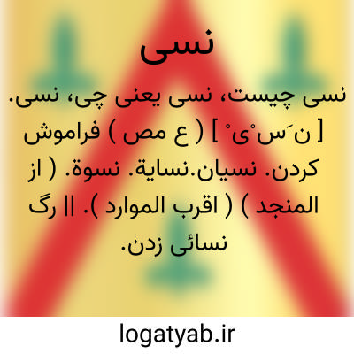 نسی. [ ن َس ْی ْ ] ( ع مص ) فراموش کردن. نسیان.نسایة. نسوة. ( از المنجد ) ( اقرب الموارد ). || رگ نسائی زدن. ( آنندراج ). رگ نسای کسی زدن. ( ازمنتهی الارب ). زدن رگ نسا را. ( از المنجد ) ( از اقرب الموارد ). بر رگ نسا زدن. ( از ناظم الاطباء ). بر عرق نسا زدن. ( تاج المصادر بیهقی ). || ( ص، اِ )فراموش شده. ( آنندراج ) ( منتهی الارب ). آنچه فراموش شده است. ( از المنجد ) ( از اقرب الموارد ). هر چیز فراموش شده و چیزی که سزاوار فراموش شدن باشد. ( ناظم الاطباء ). نِسْی. ( المنجد ) ( اقرب الموارد ) ( منتهی الارب ). || آنچه ماند به فراموشی یا اندازندش در منزلی که کوچ کرده باشند. ( آنندراج ) ( منتهی الارب ). آنچه باقی گذارند رهگذران از اشیاء نابه کار و بی ارزش. ( از المنجد ) ( از اقرب الموارد ). آنچه مسافر در منزلی که از آن کوچ کرده است بگذارد و فراموش کند. ( ناظم الاطباء ). نِسْی. ( آنندراج ). ج، انساء. || کهنه حیض که زن دور افکند. ( از اقرب الموارد ). رکوی حیض. ( مهذب الاسماء ). نِسْی. ( اقرب الموارد ). رکوک حیض که بیندازند. ( منتهی الارب ) ( آنندراج ). ج، انساء.