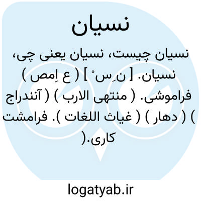 آز و نسیانش بر آتش می زند.مولوی.گنهکار را عذر نسیان بنه.سعدی.|| ( مص ) فراموش کردن. ( ترجمان علامه جرجانی ص 99 ) ( آنندراج ) ( زوزنی ) ( غیاث اللغات ) ( منتهی الارب ). نِسْی. نسایة. نسوة. ( منتهی الارب ) ( آنندراج ) ( اقرب الموارد ). از یاد کردن. از یاد بردن. || گذاشتن و ماندن چیزی را. ( از منتهی الارب ). ترک. ( یادداشت مؤلف ).