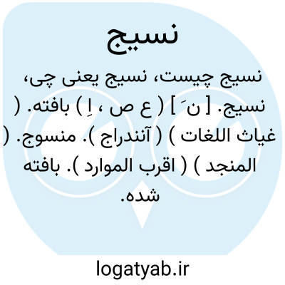 ۱ - ( صفت ) بافته منسوج.۲ - ( اسم ) پارچه ابریشمی زردوزی شده:...واز آن هزار قبائ اطلس معدنی وملکی وطمیم ونسیج وممزج ومقراضی واکسون هیچ نپسندید( مامون ). گرماه درلباس کبودمنقط است توشاه درقبای نسیج مغرقی. ( عثمان مختاری.چا.همائی.۵۱۳ )