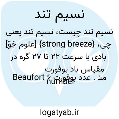 {strong breeze} [علوم جَوّ] بادی با سرعت 22 تا 27 گره در مقیاس باد بوفورت متـ. عدد بوفورت 6 Beaufort number 6