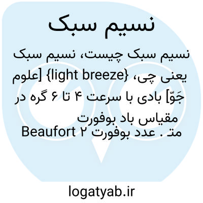 {light breeze} [علوم جَوّ] بادی با سرعت 4 تا 6 گره در مقیاس باد بوفورت متـ. عدد بوفورت 2 Beaufort number 2