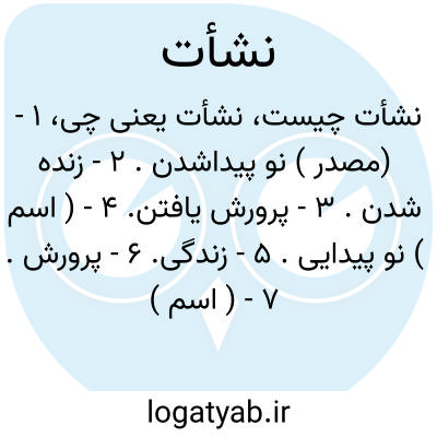 ۱ - (مصدر ) نو پیداشدن. ۲ - زنده شدن. ۳ - پرورش یافتن. ۴ - ( اسم ) نو پیدایی. ۵ - زندگی. ۶ - پرورش. ۷ - ( اسم ) جهان عالم جمع: نشات. ۸ - هر مرتبه از مراتب اشیائ اعم از مراتب عالیه یا دانیه هریک از مراتب انتقالی تکاملی اشیا: نشات دنیا نشات برزخ نشات آخرت نشات هیولی و غیره. یا نشات روح. غیبت اضافی است و حکم آن مخصوص به باطن ایمان است. یا نشات سر. غیبت حقیقی نفس است و حکم آن مختص بمقام احسان است.