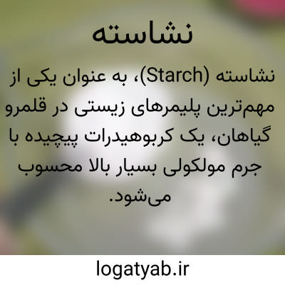 ( اسم ) پلی ساکاریدی است که در آن مقدار هنوز درست تعیین نشده وشایدبرابر۱۲ باشد.نشاسته راازعده بسیاری گیاهان خصوصاگندم وبرنج وذرت وسیب زمینی تهیه میکنند.نشاسته گندم راباعبوردادن آب ازروی آردگندم که درداخل آبکش مخصوصی ریخته اندتهیه میکنند آب ضمن عبورازروی آردهانشاسته راباخودازسوراخهای آبکش خارج میکندوماده چسبناکی بنام گلوتن درداخل آبکش باقی میماند.نشاسته جزومواد ذخیره یی گیاهان است وبرعکس سایرقندها درشیره سلولی محلول نیست بلکه بشکل دانه های جامدی درداخل یاخته هاوجوددارد. نشاسته دربرگ وساقه وریشه ومخصوصادردانه وغده های زیرزمینی یافت میشودومقدارنسبی آن دردانه گندم ۷٠ درصداست.شکل دانه های نشاسته درزیرمیکروسکپ کاملامشخص ودرهرگونه گیاهثابت است مثلادردانه گندم شکل دانه های نشاستهکروی یامتمایل بهبیضوی ودرسیب زمینی تخم مرغی شکل ودردانه برنج چندوجهی است. قطردانه های نشاستهاز۱/۱٠٠٠ تا۱/۱٠ میلیمتر متغیراست.هرگاه دانه های نشاسته رادرزیر میکرسکپ مشاهده کنیم طبقات متحدالمرکزی در آنهادیده میشودکه یک درمیان تاریک وروشن میباشند.این طبقات عبارت ازدایره هایابیضی هایی هستندکه بدورنقطه معینی دورزده اند. این نقطه که درمرکزدوایرمذکوراست بنام ناف موسوم است.طبقات تاریک بقسمتهای مرطوب وطبقات روشن بقسمتهای خشک دانه های نشاسته مربوطند.هرگاه دانه های نشاسته رادرمحلول پتاس که جسمی است آب دهنده فروبرند تمام طبقات بیک میزان مرطوب میشوندودانه ها متحدالشکل میگردند.چون آنهارادرالکل که آب گیرنده است فروبرندهمه طبقات بیک میزان خشک میشوندودانه هادراین حالت اتحادشکل مییابند.نشاسته جسمی است متبلورودانه های نشاسته درحقیقت عبارت ازبلورهای نشاسته میباشدوهرگاه دانه های نشاسته رابامیکرسکپ پلاریزان مشاهده کنندکیفیتی در آنهاظاهر میشودکه آنراکیفیت صلیب سیاه گویند ( این کیفیت درتمام اجسام بلورین دیده میشود ). دانه های نشاسته درمجاورت ید آبی رنگ میشوند ازاین جهت یدرابرای شناختن نشاسته بکار میبرند هرگاه نشاسته آبی شده راحرارت دهند رنگ آبی آن ازبین میرودوچون آنراسردکنند رنگ آبی آن مجدداظاهرمیشود.نشاسته در آب سرد حل نمیگرددولی درمحلول پتاس سردیادر آب جوش که بحرارت ۸٠ تا۱۱۵ درجه رسیده باشد دانه هایش مقداری آب جذب میکنندو آماس مینایندودراین حال جسم لزجی بوجودمیاوردکه آن را آهارنشاسته گویند.نشاسته در۱۵٠ درجه حرارت در آب حل میشودودرصورتی کهحرارت در آب حل میشودودرصورتی کهحرارتاز۱۵٠ درجه تجاوز کندملکولهایدرشت نشاسته خردمیگردندوبقطعات کوچک مبدل میشوند.جسمی که بدین صورت بدست میایددکسترین نام دارد.این جسم برخلاف نشاسته درمجاورت ید آبی رنگ نمیشود.راجع به ساختمان شیمیایی دانه های نشاسته عقاید دانشمندان مختلف است بعضی ازدانشمندان دانه نشاسته رایک جنس ومتحدالشکل میدانند وبرخی هم دانه آن راجسمی مختلف الشکل که ازدوجسم ساخته شده.این دوجسم عبارتنداز: آمیلوزکهدر آب جوش حل میشودوکاملابه مالتوز مبدل میگرددودیگر آمیلوپکتین که در آب جوش آماس میکندودر آن حل نمیشودوچون هیدرولیز شودبطورناقص به مالتوزتبدیل می یابدودرضمن عمل مقداری دکسترین بحالت تفاله باقی میماند.بنابرعقیده دوم آمیلوپکتین قسمت سطحی وپوست دانه نشاسته راتشکیل میدهد ودرون دانه یعنی قسمتهای تاریک وروشن از آمیلوزساخته شده است.دردانه نشاسته ۲٠ درصد آن آمیلوپکتین و۸٠ درصد آن آمیلوز میباشد. آمیلوزجسمی است که میتوان آنراازترکیب وتراکم چندین مولکول مالتوزباحذف مقداری آب مرکب دانست ولی آمیلو پکتین جسمی است که علاوه برقندمرکب دارای عناصرکافی ازقبیل فسفرنیزمیباشد.هرگاه آمیلوپکتین را۱۲٠ درجه حرارت دهندبه آمیلوز و انیدرید فسفریک (۲ ۵ ) مبدل میشود.ید آمیلوز را آبی رنگ و آمیلوپکتین رابنفش میکند. علاوه بر آمیلوزو آمیلوپکتین دردانه نشاسته ذرات کوچکی ازچربیهانیزیافت میشوداین ذرات باموادقندی دانه نشاسته بحالت ترکیبند.هر گاه دانه نشاسته ر