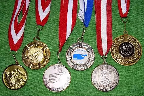 {medal} [ورزش] جایزه ای معمولاً به شکل یک قرص فلزی که بر روی آن نقش و نوشتۀ یادبود حک شده است و به رتبه های یکم تا سوم رویدادهای ورزشی اهدا می شود متـ. مدال