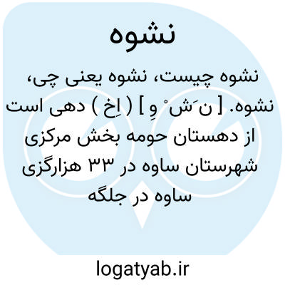 نشوه. [ ن َش ْ وِ ] ( اِخ ) دهی است از دهستان حومه بخش مرکزی شهرستان ساوه در 33 هزارگزی ساوه در جلگه سردسیری واقع است و 264 تن سکنه دارد، آبش از قنات، محصولش غلات و سیب زمینی و بنشن و میوه ها، شغل اهالی زراعت و گله داری و جاجیم بافی است. ( از فرهنگ جغرافیائی ایران ج 1 ).