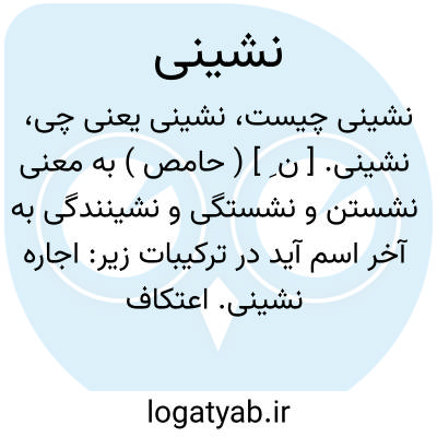 نشینی. [ ن ِ ] ( حامص ) به معنی نشستن و نشستگی و نشینندگی به آخر اسم آید در ترکیبات زیر: اجاره نشینی. اعتکاف نشینی. اورنگ نشینی. بادیه نشینی. بالانشینی. بردرنشینی. بست نشینی. بیابان نشینی. پائین نشینی. پالکی نشینی. پرده نشینی. پس نشینی. پشت میزنشینی. پیش نشینی. تخت نشینی. ته نشینی. جانشینی. جزیره نشینی. جنگل نشینی. چادرنشینی. چله نشینی. حاشیه نشینی. حجله نشینی. حومه نشینی. خاک نشینی. خاکسترنشینی. خانقاه نشینی. خانه نشینی. خرابه نشینی. خلوت نشینی. خم نشینی. خوش نشینی. درگه نشینی. دل نشینی. ده نشینی. راه نشینی. روستانشینی. ره نشینی. زاویه نشینی. زیرنشینی. زیرپانشینی. زیج نشینی. ساحل نشینی. سایه نشینی. سجاده نشینی. سدره نشینی. سرنشینی. شب نشینی. شهرنشینی. صحرانشینی. صدرنشینی. صف نشینی. صفه نشینی. صومعه نشینی. کاخ نشینی. کجاوه نشینی. کرایه نشینی. کرسی نشینی. کشتی نشینی. کناره نشینی. کوه نشینی. گاه نشینی. گوشه نشینی. عزلت نشینی. عقب نشینی. عماری نشینی. محمل نشینی. مرزنشینی. مسجدنشینی.مسندنشینی. والانشینی. ویرانه نشینی. هم نشینی. هودج نشینی. رجوع به هر یک از این کلمات در ردیف خود شود.