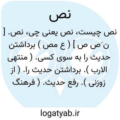 نص. [ ن َص ص ] ( ع مص ) برداشتن حدیث را به سوی کسی. ( منتهی الارب ). برداشتن حدیث را. ( از زوزنی ). رفع حدیث. ( فرهنگ خطی ). برگردانیدن حدیث را به سوی کسی که حدیث کرده بود. ( از ناظم الاطباء ).برداشتن و اسناد دادن حدیث را به کسی. ( از متن اللغة ). رفع و اسناد دادن حدیث را به کسی که حدیث کرده است. ( از اقرب الموارد ) ( از المنجد ). || اسناد کردن به سوی رئیس بزرگ. ( از منتهی الارب ) ( آنندراج ). اسناد دادن. ( از ناظم الاطباء ). نص الی رئیس الاکبر. || برداشتن. ( از منتهی الارب ) ( آنندراج ). بلند کردن چیزی. ( غیاث اللغات ). || گردن بلند کردن. ( از المنجد ). || آشکار کردن چیزی را. ( از منتهی الارب ) ( از آنندراج ) ( از ناظم الاطباء ). آشکارا کردن. ( تاج المصادر بیهقی ) ( دهار ) ( غیاث اللغات ). آشکار کردن حدیث. ( زوزنی ). || آشکار شدن چیزی. ( از اقرب الموارد ) ( از المنجد ). || واقف گردانیدن بر چیزی. ( از منتهی الارب ) ( آنندراج ) ( از ناظم الاطباء ). || معین نمودن برچیزی. ( از منتهی الارب ) ( آنندراج ). تعیین کردن چیزی را. ( از ناظم الاطباء ). تعیین کردن کسی را بر چیزی. ( از اقرب الموارد ). || بر منصه نشاندن عروس را. ( از منتهی الارب ) ( آنندراج ) ( از متن اللغة ) ( از اقرب الموارد ) ( از المنجد ). نشانیدن عروس را بر کرسی.( از ناظم الاطباء ). || نیک باریکی کردن درپرسیدن تا غایت آن را بدانی. ( از منتهی الارب ) ( آنندراج ) ( از غیاث اللغات ). نیک پرسیدن از چیزی. ( تاج المصادر بیهقی ). دقت کردن در پرسیدن چیزی تا غایت آن. ( از ناظم الاطباء ). استقصاکردن در سؤال از چیزی تا نهایت آن را به دست آوردن. ( از متن اللغة ) ( از اقرب الموارد ) ( از المنجد ). || سخت شدن کار. نص الامر؛ اشتد. ( متن اللغة ). || نیک راندن. ( تاج المصادر بیهقی ). نیک راندن شتر را. ( آنندراج ) ( از منتهی الارب ) ( از المنجد ). نیک براندن. ( زوزنی ). برانگیختن و راندن ناقه را به آخرین سرعتش. ( از اقرب الموارد ). نص الدابه؛ تا هنگامی که تک داشت راند آن ستور را. ( از ناظم الاطباء ). || رفتن شتر. ( از منتهی الارب ). رفتن. ( آنندراج ). || جنبانیدن. ( منتهی الارب ) ( از ناظم الاطباء ). حرکت دادن چیزی را. ( از ناظم الاطباء ) ( از متن اللغة ) ( از اقرب الموارد ) ( از المنجد ). گویند: نص انفه غضبا و هو نصاص الانف. ( متن اللغة ). || سرجنبانیدن. ( آنندراج ). || بر یکدیگر نهادن رخت را. ( از منتهی الارب ) ( آنندراج ) ( از متن اللغة ). گذاردن متاع را بالای همدیگر. ( فرهنگ خطی ). کالاها را بر روی یکدیگر گذاشتن. ( از ناظم الاطباء ) ( از اقرب الموارد ) ( از المنجد ). || آواز کردن کباب و بریانی بر آتش. ( از متن اللغة ). نصیص. رجوع به نصیص شود. || جوشیدن دیگ. ( از متن اللغة ).نصیص. رجوع به نصیص شود. || ( اِ ) نهایت هر چیزی. ( از منتهی الارب ) ( آنندراج ) ( ناظم الاطباء ) ( از متن اللغة ) ( از اقرب الموارد ) ( از المنجد ). || حدیث مرفوع. ( مهذب الاسماء ). کلام منصوص. ( المنجد ). || رفع. ظهور. ( ناظم الاطباء ). || اسناد به سوی رئیس بزرگتر. ( ناظم الاطباء ) ( از متن اللغة ). || توقیف بر چیزی ( ناظم الاطباء ). توقیف. ( متن اللغة ). || تعیین. ( ناظم الاطباء ). تعیین بر چیزی. ( ازمتن اللغة ). || نص الحقاق؛ کنایت از نهایت بلوغ عقلی. ( از متن اللغة ). منتهی بلوغ عقل. ( اقرب الموارد ). و نیز رجوع به منتهی الارب شود. || ( ص ) سیر نص، رفتار بنهایت تیز و رفیع. ( منتهی الارب ) ( آنندراج ). رفتار تند و تیز و شتاب. ( از ناظم الاطباء ). جِدّ رفیع. ( از متن اللغة ) ( از اقرب الموارد ).