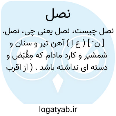 نصل. [ ن َ ] ( ع اِ ) آهن تیر و سنان و شمشیر و کارد مادام که مِقْبَض و دسته ای نداشته باشد. ( از اقرب الموارد ). آهن [ تیغه یا پیکان ] بدون قبضه نیزه و تیر و کارد و شمشیر. ( از معجم متن اللغة ) ( از المنجد ). پیکان. ( دهار ). ج، انصل، نصال، نصول. رجوع به معانی بعدی شود. || پیکان تیر. ( غیاث اللغات ) ( منتهی الارب ) ( آنندراج ) ( ناظم الاطباء ) ( مهذب الاسماء ). ج، نصول، نصال. || پیکان نیزه. ( غیاث اللغات ) ( منتهی الارب ) ( آنندراج ) ( ناظم الاطباء ). ج، نصول، نصال. || تیغ بی قبضه. ( منتهی الارب ) ( آنندراج ) ( ناظم الاطباء ). تیغ شمشیر. ( مهذب الاسماء ). تیر. ( دهار ). || کارد بی دسته. ( ناظم الاطباء ) ( از منتهی الارب ) ( از آنندراج ). ج، انصل، نصال، نصول. || آنچه نو بیرون آمده باشد از گیاه بهمی. ( منتهی الارب ) ( آنندراج ) ( از متن اللغة ) ( از اقرب الموارد ). || سر، با همه اجزای آن. ( از منتهی الارب ) ( از آنندراج ) ( از ناظم الاطباء ). رأس با آنچه در آن است. ( از متن اللغة ) ( از اقرب الموارد ). || تندی پس سر. ( منتهی الارب ) ( آنندراج ) ( ناظم الاطباء ). || اعلای سر. ( منتهی الارب ) ( آنندراج ) ( از متن اللغة ) ( از اقرب الموارد ). بلندی سر. ( ناظم الاطباء ). قمحدوه. ( متن اللغة ) ( اقرب الموارد ). || رشته از دوک برآمده. ( منتهی الارب ) ( آنندراج ) ( ناظم الاطباء ) ( از متن اللغة ) ( از اقرب الموارد ). || درازی سر شتر و اسب. ( منتهی الارب ) ( آنندراج ) ( از ناظم الاطباء ). طول رأس در اشتر و اسب، در مورد انسان اطلاق نمی شود. ( از متن اللغة ) ( از اقرب الموارد ). || ( ص ) معول نصل؛ میتین دسته درآمده. ( منتهی الارب ) ( آنندراج ) ( از ناظم الاطباء ) ( از متن اللغة ) ( از اقرب الموارد ). || ( مص ) درنشستن پیکان تیردر چیزی. ( از منتهی الارب ) ( آنندراج ) ( از ناظم الاطباء ). || درنشاندن پیکان را در چیزی. ( از منتهی الارب ) ( از ناظم الاطباء ) ( از متن اللغة ). || برنشاندن پیکان را بر تیر. ( از ناظم الاطباء ). || ثابت ماندن پیکان و برنیامدن. ( از ناظم الاطباء ). ثابت ماندن پیکان تیر در چیزی و بیرون نیامدن. ( از متن اللغة ). || بیرون آمدن پیکان. ( از ناظم الاطباء ). بیرون آمدن پیکان از تیر. ( ازمتن اللغة ). || برآمدن چیزی از محل خود. ( از ناظم الاطباء ). خارج شدن. ( از المنجد ) ( از اقرب الموارد ). گویند: نصل السهم من نصله، نصلت الخیل من الغبار، نصل الطریق موضع کذا. ( المنجد ) ( از اقرب الموارد ).و نصل علینا فلان من الشعب و نحوه. ( اقرب الموارد ).
