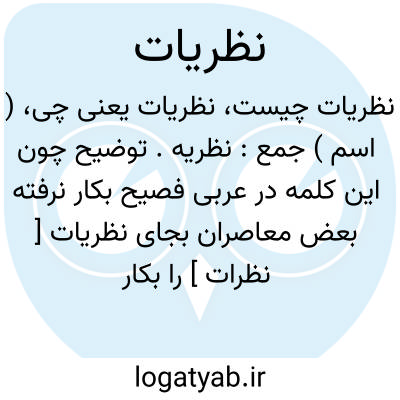 ( اسم ) جمع: نظریه. توضیح چون این کلمه در عربی فصیح بکار نرفته بعض معاصران بجای نظریات [ نظرات ] را بکار برند ولی نظرات در متون فارسی استعمال نشده و در عربی هم بمعنای دیگریست و از سوی دیگر [ نظریات ] جای خود را در تداول باز کرده است و حتی نویسندگان معاصر عربی زبان هم آنرا بکار میبرند. و حتی این کلمه در فرهنگهای عربی معاصر هم وارد شده.