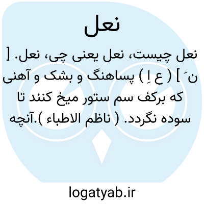 (اسم ) ۱ - کفش پا افزار. ۲ - قطعه ای آهنی که بپاشنه کفش یاسم چارپاکوبند: پیش نعل سمند او خارا همچو در پیش مه کتان باشد. ( وحشی بافقی.چا.امیرکبیر ۱۸۷ ) جمع: نعال. ۳ - نعل زدن: تو نبینی که اسب توسن را بگه نعل برنهند لبیش. ( عنصری لغ.: لبیش ) ۴ - ( کشتی ) آلتی که کشتی گیران با آن ورزش میکرده اند. امروزه آنرا [سنگ نعل] گویند. توضیح میرنجات سنگ و نعل را جداگانه وصف کرده: جگر سنگ شود خون ز نگاه مستش دل سنگین بتان سنگ صفت در دستش نعل هرگه بکف آن لب مهوش دارد ماه نو در هوسش نعل در آتش دارد. ( گل کشتی. توبا۳۸۹ ۴۷ - ۴۶ ) یا نعل بازگون ( باژگون باژگونه ).اجرای امری بطوری که دیگران متوجه نشوند. یا نعل شام. ۱ - ماه قمر. ۲ - دمیدن صبح. یانعل و داغ.رسمی بود که قلندران و عاشق پیشگان سینه خود را داغ میزدند و بوسیله ناخن تراش شکل بر سینه ظاهر میکردند: برسینه نعل و داغم بس لاله و گل من تا کی نگه چرانی در باغ وراغ مردم ? ( ظهوری سراج اللغات فرنظا. ) یا گاهی به نعل و گاهی بمیخ زدن. دو جانبه بازی کردن ظاهرا و باطنا علیه کسی یا جمعیتی رفتار کردن. یا نعل باژگون ( باژگونه باشگونه وارون وارونه واژگون واژگونه واژون واژونه ) زدن. کاری را طوری انجام دادن که دیگران متوجه نشوند. توضیح مرسوم بودکه دزددرموقعی که میخواست کسی نفهمد از کدام جا رفته نعل وارونه باسب خود میزد تا نشان پاهای اسب بعکس راهی که رفته بر خاک نقش بندد. جنگیان نیز در مقام خدعه جنگی چنین میکرده اند. یا در آتش افکندن (انداختن داشتن نهادن ). بیقرار گردانیدن کسی را در عشق دیگری. توضیح در علوم مکنونه رسم است که بر روی نعل اسب نام محبوب و معشوق را با بعض اوراد نویسند و آنرا در آتش نگاهدارند. معتقدند تا زمانی که آن نعل در آتش باشد محبوب شدیداد لباخته عاشق باشد و گویند برای رهایی از تاثیر این طلسم باید آن نعل را از آتش در آورند و سوراخ کنند. فلفل در آتش افکندن. یا نعل در آتش بودن. بی قرار بودن مضطرب بودن.