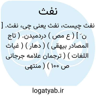 نفث. [ ن َ ] ( ع مص ) دردمیدن. ( تاج المصادر بیهقی ) ( دهار ) ( غیاث اللغات ) ( ترجمان علامه جرجانی ص 100 ) ( منتهی الارب ) ( آنندراج ). دمیدن. پف کردن. فوت کردن. ( یادداشت مؤلف ). فی اللغة شبیهة بالنفح، و یقال هو نفح بلاریق. ( بحر الجواهر ) ( یادداشت مؤلف ). || تف کردن. ( از ناظم الاطباء ). خیو انداختن. اخراج خلط. ( یادداشت مؤلف ) ( از متن اللغة ) ( از اقرب الموارد ). || فضله چیزی از دهان انداختن. ( غیاث اللغات ) ( آنندراج ). از دهان برون افکندن. ( از اقرب الموارد ). || افکندن چیزی را. ( از متن اللغة ). || برآمدن رطوبت را طبیبان به تازی نفث گویند. ( ذخیره خوارزمشاهی ) ( یادداشت مؤلف ). || تکلم. سخن گفتن. ( یادداشت مؤلف ). || جادو کردن کسی را. ( از اقرب الموارد ) ( از المنجد ). رجوع به نفاث شود. || در طب بیشتر بر آنچه که از مجرای قصبةالریة خارج می گردد اطلاق می شود. و نیز بر خارج شدن چیزی از نای اطلاق شود و مراد از آن افکندن از دهان است. ( از بحر الجواهر ). رطوبتی را گویند که در نزله و علت ذات الریه و ذات الجنب به سعال برآید، و آنچه خام برآید آن را به تازی بصاق گویند. ( ذخیره خوارزمشاهی ) ( یادداشت مؤلف ). رطوبتی که با سرفه برآید. ( یادداشت مؤلف ): چنانکه اندر بیماری های اندامهای دم زدن اندر حال نفث نگاه کند و اثر نضح اندر نفث جوید. ( ذخیره خوارزمشاهی ).