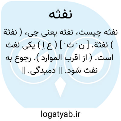 ( نفثة ) نفثة. [ ن َ ث َ ] ( ع اِ ) یکی نفث است. ( از اقرب الموارد ). رجوع به نفث شود. || دمیدگی. || دمیدگی افسونگر و دم دهنده. ( ناظم الاطباء ). || انداخته شده. ( یادداشت مؤلف ). || کلام. ( یادداشت مؤلف ).