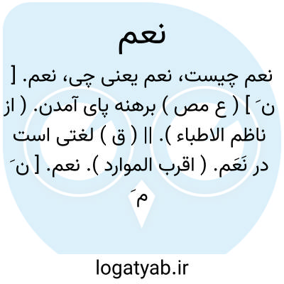 نعم. [ ن َ ع َ ] ( ع ق ) کلمه ایجاب و تصدیق به معنی آری و بلی. ( از غیاث اللغات ). حرف جواب است و اگربعد از ماضی واقع شود معنی آن تصدیق است چنانکه در «هل قام زید» و اگر بعد از مستقبل واقع شود معنی آن وعده است چنانکه «نعم » در جواب «هل تقول ». || بلی. آری. اجل. مقابل لا به معنی نه: