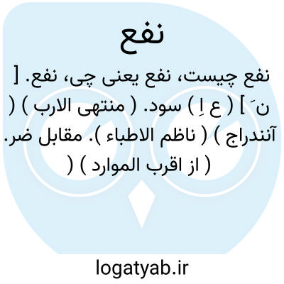 نفع. [ ن َ ] ( ع اِ ) سود. ( منتهی الارب ) ( آنندراج ) ( ناظم الاطباء ). مقابل ضر. ( از اقرب الموارد ) ( از متن اللغة ). فایده. منفعت. حاصل. بیاور. نوا. پیداوار. ربا. ( ناظم الاطباء ). خنج. نجع. بر. بهره. مقابل ضرر وزیان. ( یادداشت مؤلف ). ثمر. خیر. بهر: