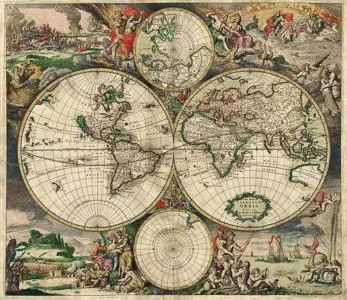 نقشه جهان (خرارد فان اسخاخن). خرارد فان اسخاخن[ یادداشت ۱] نقشه نگار هلندی در سال ۱۶۸۹ ( میلادی ) در آمستردام نقشه ای از جهان ترسیم کرد. این نقشه به سبک کنده کاری با فلز مس و رنگ کاری دستی تزئین شده است. نقشه مس آرایی شده، نقشه ای کمیاب است و فقط یک رونوشت از آن در دانشگاه آمستردام می باشد و نسخه ای مشابه در کتابخانه های آمریکا ندارد. نکته قابل توجه نام خلیج فارس است که به زبان لاتین قدیمی: Sinus Persicus امروزه:Sinus Persici در نقشه آورده شده است. در این نقشه طول ها و عرض های جغرافیایی و همچنین خط استوا درج شده است. در این سند، نقاشی هایی با موضوعات جنگ، جانوران، انسان های حیوان نما، عشق، دریانوردی، کشاورزی و دامپروری کشیده شده است. این نقشه قدیمی امروزه با ابعاد ۴٫۵۶۰ در ۳٫۹۳۶ به صورت دیجیتالی تهیه شده است. ابعاد اصلی نقشه ۴۸٫۳ در ۵۶ سانتی متر می باشد.