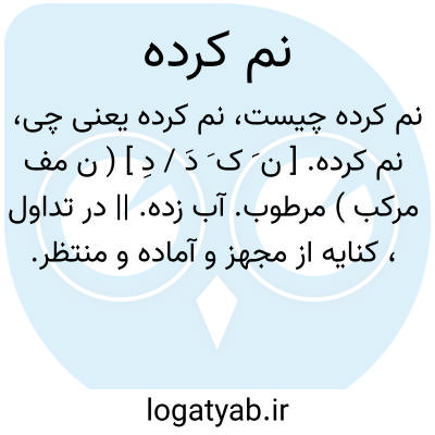 نم کرده. [ ن َ ک َ دَ / دِ ] ( ن مف مرکب ) مرطوب. آب زده. || در تداول، کنایه از مجهز و آماده و منتظر. گویند: همیشه چند نفر نم کرده دارد؛ همیشه چند تن در انتظار و به فرمان اویند.