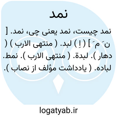 نمد. [ ن َ م َ ] ( اِ ) لبد. ( منتهی الارب ) ( دهار ). لبدة. ( منتهی الارب ). نمط. لباده. ( یادداشت مؤلف از نصاب ). نوعی از فرش که از پشم یا کرک مالیده حاصل می شود. سیاکیز. ( ناظم الاطباء ). گستردنی که از پشم مالیده کنند. ( یادداشت مؤلف ). پارچه ای کلفت که از پشم یا کرک مالیده سازند و از آن فرش و کلاه و جامه کنند. ( فرهنگ فارسی معین ): و از وی [ خوارزم ] روی مخده و قزاکند و نمد و کرباس و ترف و رخبین خیزد. ( حدود العالم ).