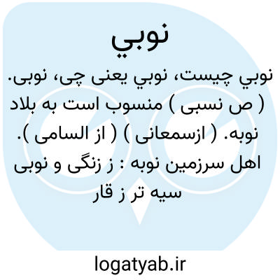 نوبی. ( ص نسبی ) منسوب است به بلاد نوبه. ( ازسمعانی ) ( از السامی ). اهل سرزمین نوبه: