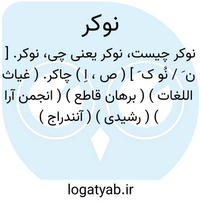 ( صفت اسم ) ۱ - چاکر خدمتکار گماشته: (( سلطان او را با نوکران خلعت و خواسته بی اندازه داد. ) ) ( سلجوقنام. ظهیری. چا. خاور. ۱۲ ) توضیح بخدمتکار مرد اطلاق شود: مقابل کلفت. ۲ - رفیق دوست ۳ - شاور. ۴ - عضو اداره ( دولتی ).