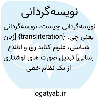 {transliteration} [زبان شناسی، علوم کتابداری و اطلاع رسانی] تبدیل صورت های نوشتاری از یک نظام خطی به یک نظام خطی دیگر