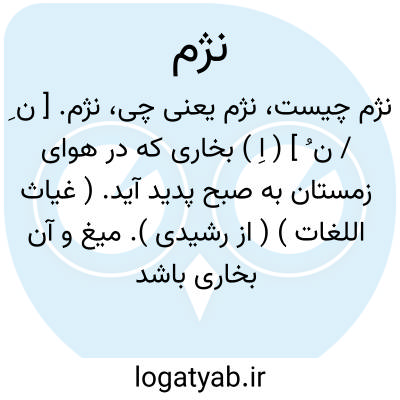 نژم. [ ن ِ / ن ُ ] ( اِ ) بخاری که در هوای زمستان به صبح پدید آید. ( غیاث اللغات ) ( از رشیدی ). میغ و آن بخاری باشد تاریک و ملاصق زمین که عربان ضباب خوانند. ( از برهان قاطع ). بخاری که در هوای زمستان پدید آید و اطراف زمین را تیره کند و آن را میغ نیز گویند. ( انجمن آرا ).بخاری که در تابستان پدید آید و اطراف زمین را تیره کند و آن را میغ نیز گویند. ( آنندراج ). ابر و بخار و دود و میغ و بخاری ملاصق زمین که هوا را تاریک کند.( ناظم الاطباء ). نژیم. ( شعوری ). نزم. ( شعوری ) ( حاشیه برهان قاطع چ معین ). رجوع به نزم شود:
