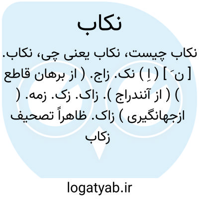 نکاب. [ ن َ ] ( اِ ) نک. زاج. ( از برهان قاطع ) ( از آنندراج ). زاک. زک. زمه. ( ازجهانگیری ) زاک. ظاهراً تصحیف زکاب است. ( رشیدی ). || بعضی آب زاج را گفته اند. || بعضی گویند مخفف نمک آب است. ( برهان قاطع ) ( آنندراج ).