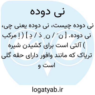 نی دوده. [ ن َ / ن ِ دَ / دِ ] ( اِ مرکب ) آلتی است برای کشیدن شیره تریاک که مانند وافور دارای حقه گلی است و چوبی دارد و شیره را با چراغ به وسیله آن می کشند. ( از فرهنگ عامیانه جمال زاده از فرهنگ فارسی معین ).