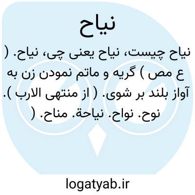 نیاح. ( ع مص ) گریه و ماتم نمودن زن به آواز بلند بر شوی. ( از منتهی الارب ). نوح. نواح. نیاحة. مناح. ( اقرب الموارد ) ( منتهی الارب ). رجوع به نَوح شود. || ( اِ ) گریه. زاری. شیون. ( فرهنگ فارسی معین ).