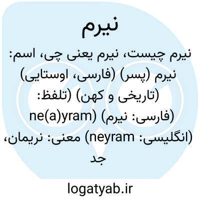 اسم: نیرم (پسر) (فارسی، اوستایی) (تاریخی و کهن) (تلفظ: ne(a)yram) (فارسی: نيرم) (انگلیسی: neyram)