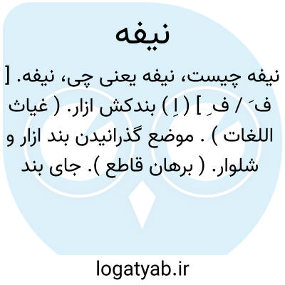 ( اسم ) ۱ - موضع گذرانیدن بند شلوار کمر شلوار که بند را از آن گذرانند. ۲ - بند شلوار: (( هست پیراهنی و شلواری نیست بر هر دو نیفه و تیریز. ) ) ( مسعود سعد. ۳ ) ۶٠۳ - پوستی که از حوالی ناف روباه و جز آن گیرند: (( شیر کز مالش عدل تو دباغت یابد گردنش نرم تر از نیف. روباه شود. ) ) ( شرف شفروه رشیدی ) ۴ - پارچ. چهار گوشه ای که در آن لباس و غیره پیچند: بقچه: (( جگر سوخته در نیفه که این ناف. مشک سرب در گوش. رومال که این نقر. خام ) ) ( وحشی. چا. امیر کبیر ۴۷ )