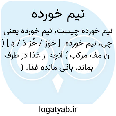 نیم خورده. [ خوَرْ / خُرْ دَ / دِ ] ( ن مف مرکب ) آنچه از غذا در ظرف بماند. باقی مانده غذا. ( ناظم الاطباء ). نیم خورد. پس مانده. بازمانده. سؤر. ته مانده. وامانده. فضله خوان. دهن زده. بقیه و پس مانده خوراکی که دیگری قدری از آن خورده است: