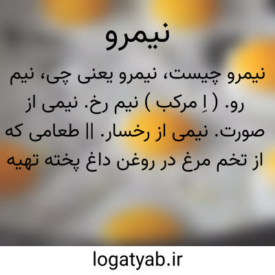 نیم رو. ( اِ مرکب ) نیم رخ. نیمی از صورت. نیمی از رخسار. || طعامی که از تخم مرغ در روغن داغ پخته تهیه کنند. تخم مرغی که در روغنی بر آتش جوشان بشکنند و بپزند. || ( ص مرکب ) گوهر و مروارید که از یک طرف گرد و از طرف دیگر مستوی باشد. ( آنندراج ). جواهر و مرواریدی که یک طرفش مدور و طرف دیگرش پهن باشد ( ناظم الاطباء ):