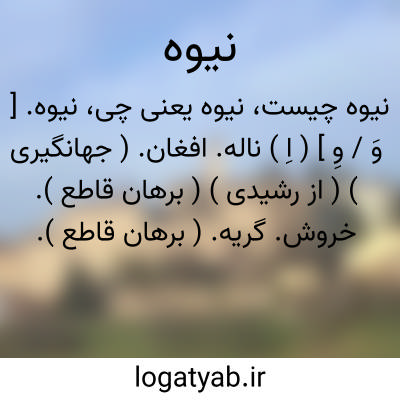 نیوه. [ وَ / وِ ] ( اِ ) ناله. افغان. ( جهانگیری ) ( از رشیدی ) ( برهان قاطع ). خروش. گریه. ( برهان قاطع ). نوحه و امثال آن. ( آنندراج ) ( انجمن آرا ) ( از برهان ):