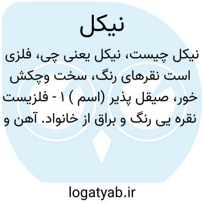 (اسم ) ۱ - فلزیست نقره یی رنگ و براق از خانواد. آهن و بسیار صیقل پذیر. وزن مخصوص آن در حدود ۸/۸ و وزن اتمی آن قریب ۵۸ است و در حدود ۱۴۵۱ درجه حرارت ذوب میشود. کاملا چکش خوار و قابلیت تورق و مفتول شدن آن زیاد است بحدی که میتوان ازان مفتولهایی بقطر ۱/۱٠٠ میلی متر و ورقه هایی بضخامت ۲/۱٠٠ میلی متر تهیه کرد. این فلز در سال ۱۷۷۱ میلادی به وسیل. کرنستد سوئدی کشف شد. نیکل مانند آهن بوسیل. آهن ربا جذب میشود ( ولی این خاصیت را کمتر از آهن دارد ). نیکل در برابر عوامل خارجی بهتر از آهن مقاومت میکند. اکسیژن هوای خشک برنیکل اثری نداردوبکمک رطوبت هم بکندی بر آن اثر میکند. بهمین مناسبت نیکل برای حفظ فولاد از زنگ در فولاد سازی بکار میرود. در حرارت قرمز هم بر عکس آهن تنها سطح آن اکسید میشود. از اسیدها جوهر نمک و جوهر گوگرد بسختزی با نیکل ترکیب میگردند و برعکس جوهر شوره به آسانی با آن ترکیب میشود. مهمترین نمکهای نیکل که در هم. آنها نیکل دو ظرفیتی است سولفات نیکل و نتیرات نیکل و کلرو نیکل است که همه با ۶ ملکول آب متبلور میشوند. نیکل در برابر بازها بخوبی مقاومت میکند و از اینرو بوته های نیکل در آزمایشگاه برای گرم کردن قلیاها بکار میبرند. نمکهای نیکل اگر خشک باشند زرد رنگ هستند و با سولفور آمونیوم رسوب سیاه سولفور نیکل میدهند که تنها در اسید حل میشود ( یکی از طرق شاسایی نمکهای نیکل ). نیکل را برای سکه زدن پشیز بکار میبرند و برای ساختن گلوله های توپ و بمب ها نیز استعمال میشود. بعلاوه از آن برای آب نیکل کاری استفاده میکنند (ملحی که جهت آب نیکل کاری بکار میرود سولفات مضاعف نیکل و آمونیوم است. ۲ - مسکوکی است برابر ۵ سنت معمول در ایالات متحد. امریکا.