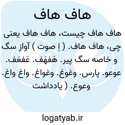هاف هاف. ( اِ صوت ) آواز سگ و خاصه سگ پیر. هَفهَف. عَفعَف. عوعو. پارس. وغوغ. وغواغ. واغ واغ. وعوع. ( یادداشت به خط مؤلف ). رجوع به پارس شود. || ( اِ ) سگ در زبان اطفال. ( یادداشت مؤلف ).
