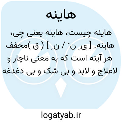 هاینه. [ ی ِ ن َ / ن ِ ] ( ق )مخفف هر آینه است که به معنی ناچار و لاعلاج و لابد و بی شک و بی دغدغه باشد. ( برهان ). کلمه تأکید یعنی هرآینه و ناچار و لاعلاج و لابد و بی شک و بی دغدغه و البته.( ناظم الاطباء ). مخفف هرآینه. ( رشیدی ) ( جهانگیری ).