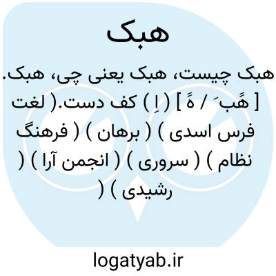 هبک. [ هََب َ / هََ ] ( اِ ) کف دست.( لغت فرس اسدی ) ( برهان ) ( فرهنگ نظام ) ( سروری ) ( انجمن آرا ) ( رشیدی ) ( ناظم الاطباء ) ( آنندراج ):