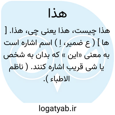 هذا. [ ها ] ( ع ضمیر، اِ ) اسم اشاره است به معنی «این » که بدان به شخص یا شی قریب اشاره کنند. ( ناظم الاطباء ). مرکب از ها و ذا اشاره. ( از اقرب الموارد ).