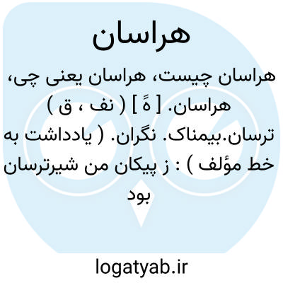 ۱- (صفت ) هراس دارنده بیمناک: (( زپیکان من شیرترسان بود زخم کمندم هراسان بود. ) ) ( شا.لغ. ) ۲- درحال بیمناکی باترس: (( چون این خبر راشنید هراسان نزدبرادر رفت. ) ) یا هراسان و وراسان. (هراسون و وراسون ): هراسان